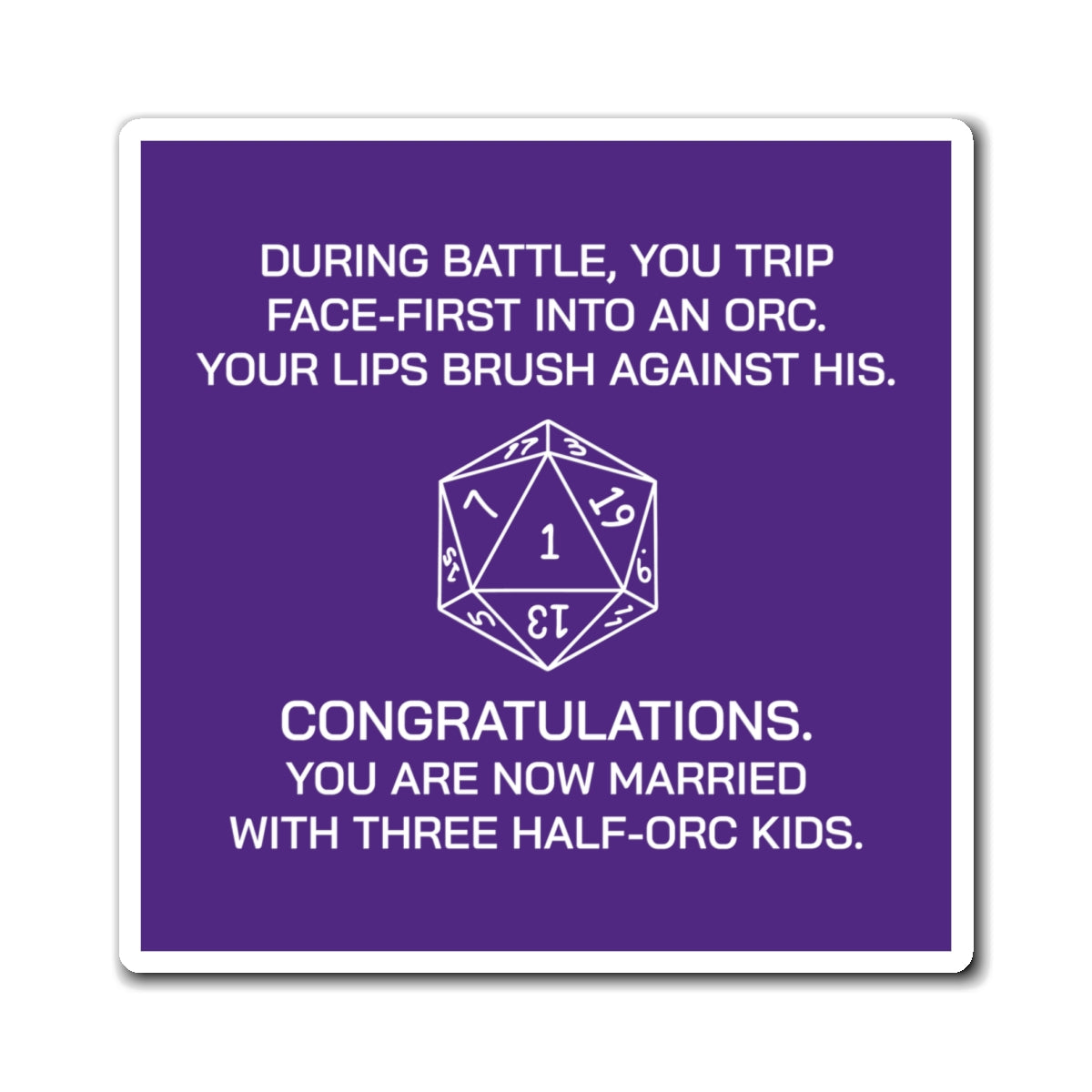"During battle, you trip face-first into an Orc. You lips brush against his. Congratulations. You are now married with three half-orc kids."
